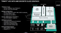 Die überarbeitete DirectX-11-kompatible Grafikeinheit von AMDs APU Trinity auf Basis der Generation 6000M/7000M (VLIV4) hat bis zu 384 Radeon-Cores und einen HD-Videobeschleuniger. Weitere Details finden sie bei der Slides unten. Bereits zur CES 2012 in Las Vegas hatte AMD mit einer Demonstration der kommenden Quad-Core Fusion-APU Trinity für Notebooks überrascht.