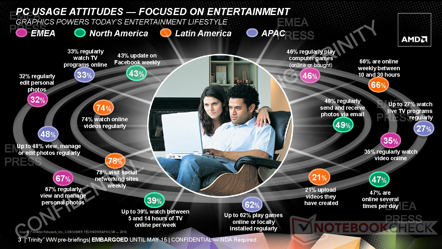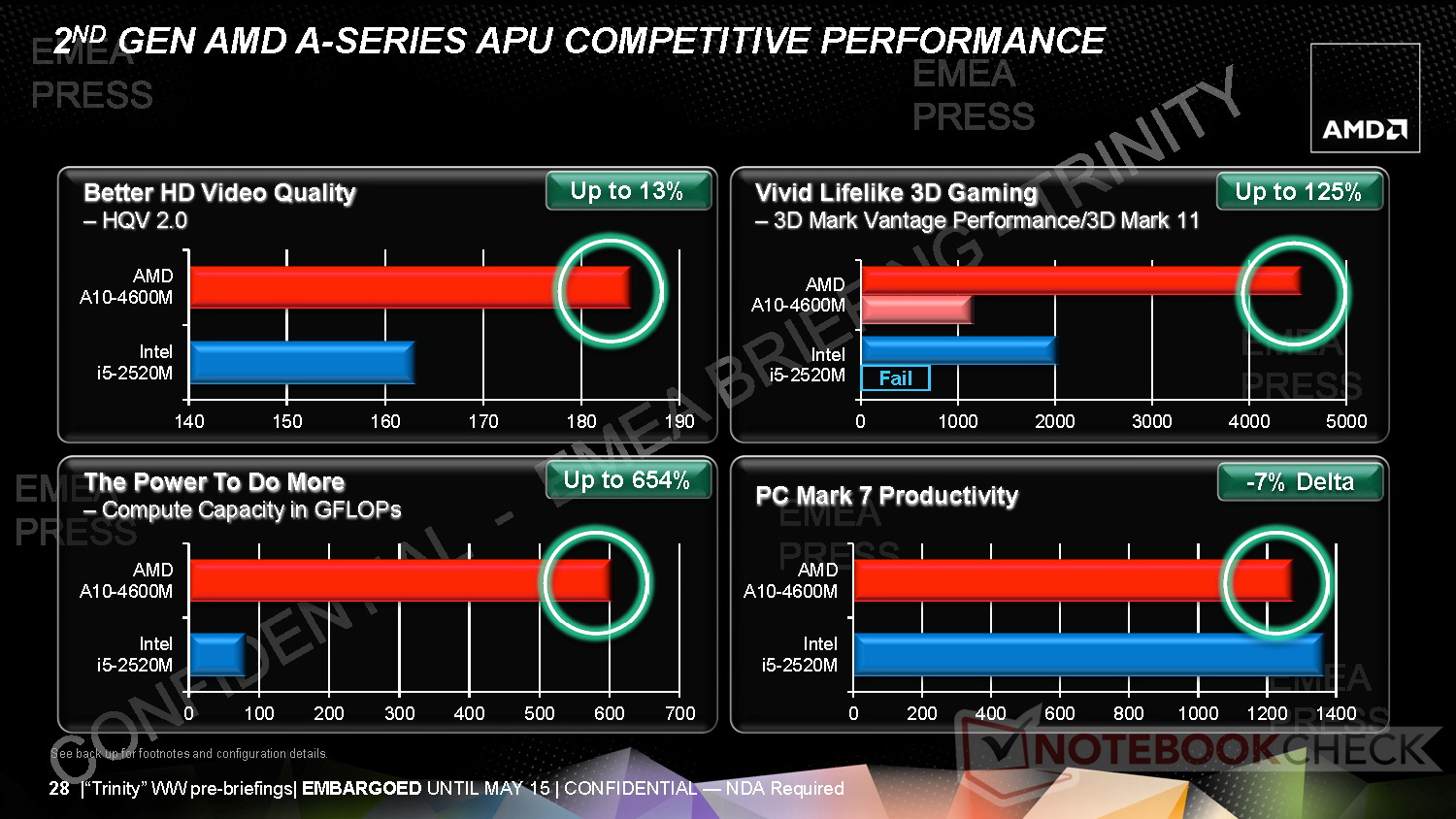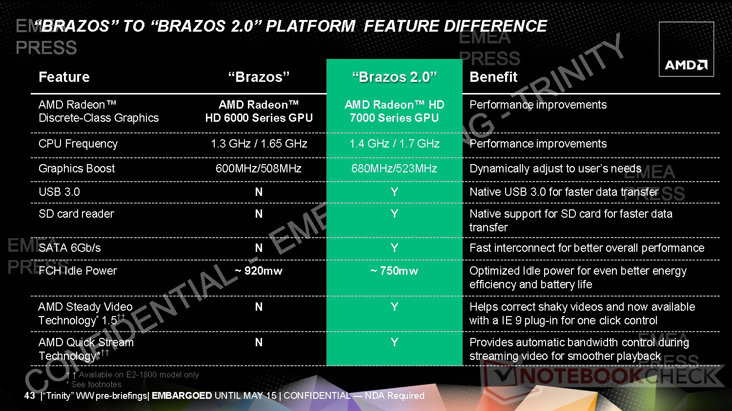 Neben dem Rollout seiner neuen APU-Serien der Generation Trinity berichtete AMD auch über den 24/7-Zugriff auf Inhalte seiner Entwicklerplattform Fusion Developer Summit Digital (AFDS-D) und die aufgefrischte "Brazos 2.0"-Plattform. Als erste 2012er AMD A-Serie Notebook-APUs bestätigte AMD zudem folgende Modelle:
