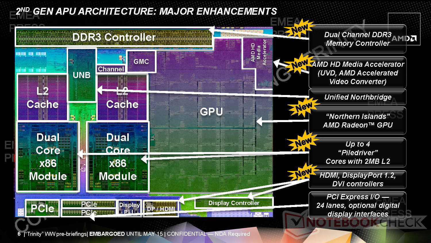 Als wichtigste Neuerungen der 2. Generation APU-Architektur Trinity führt AMD folgende Verbesserungen an: