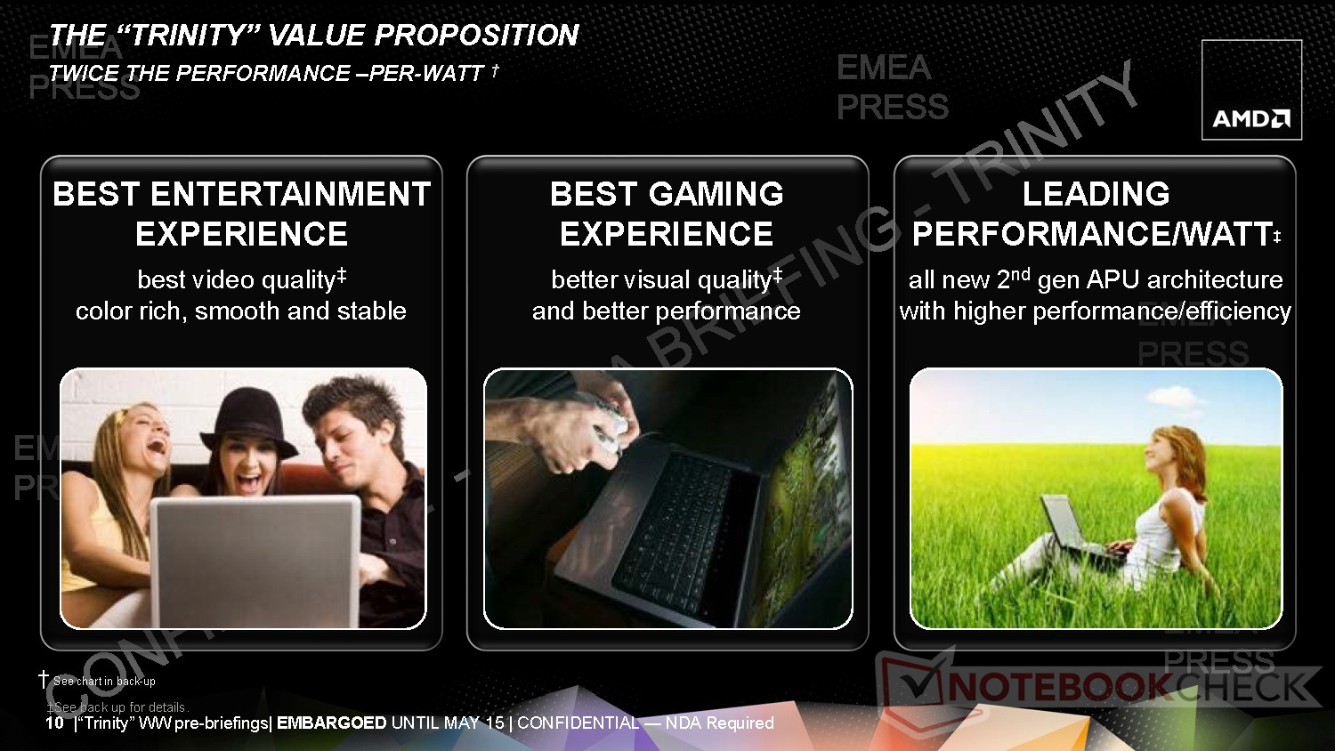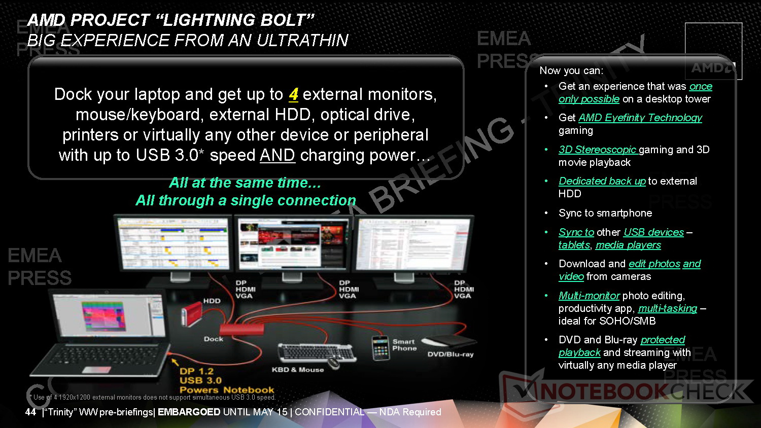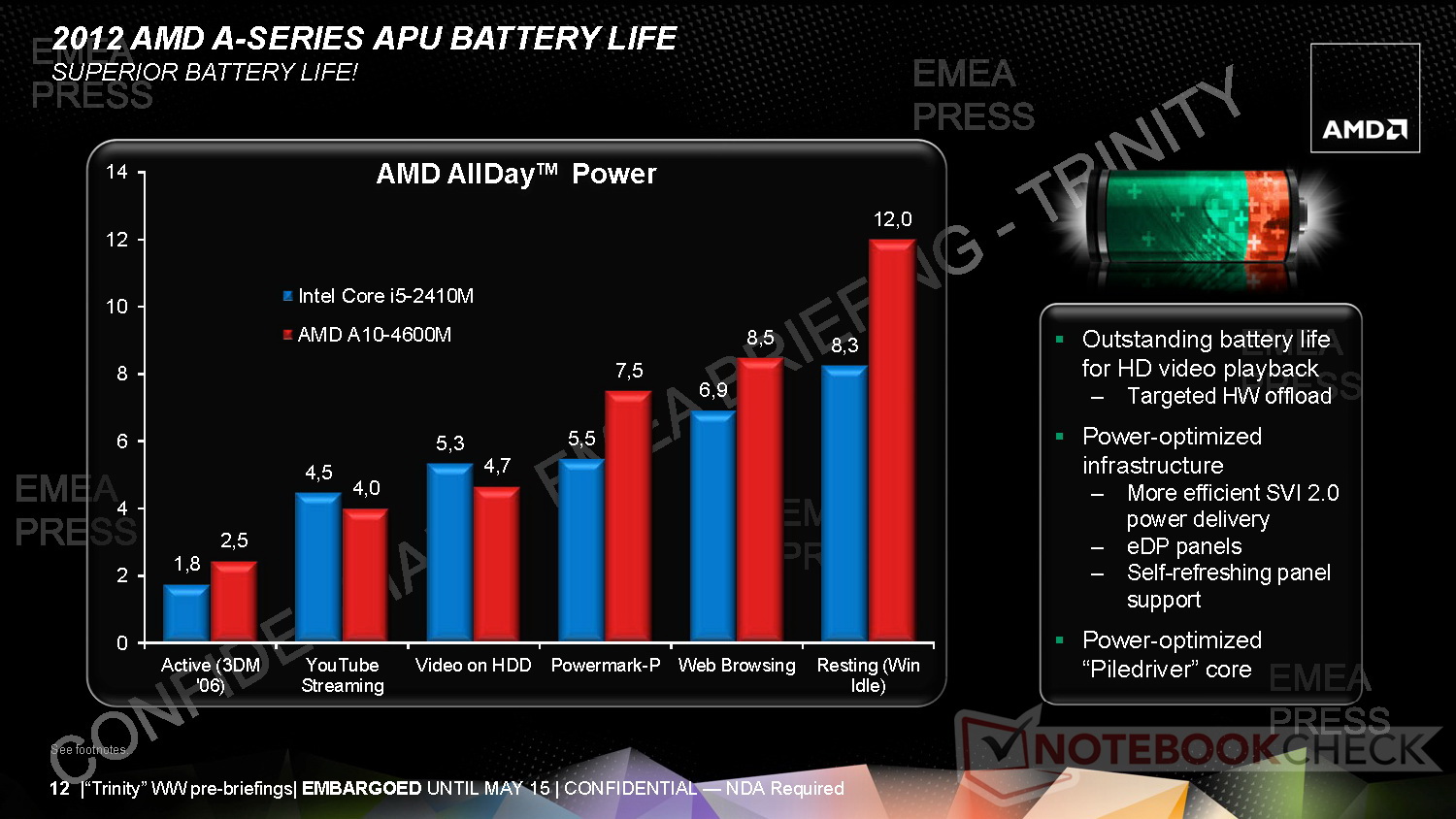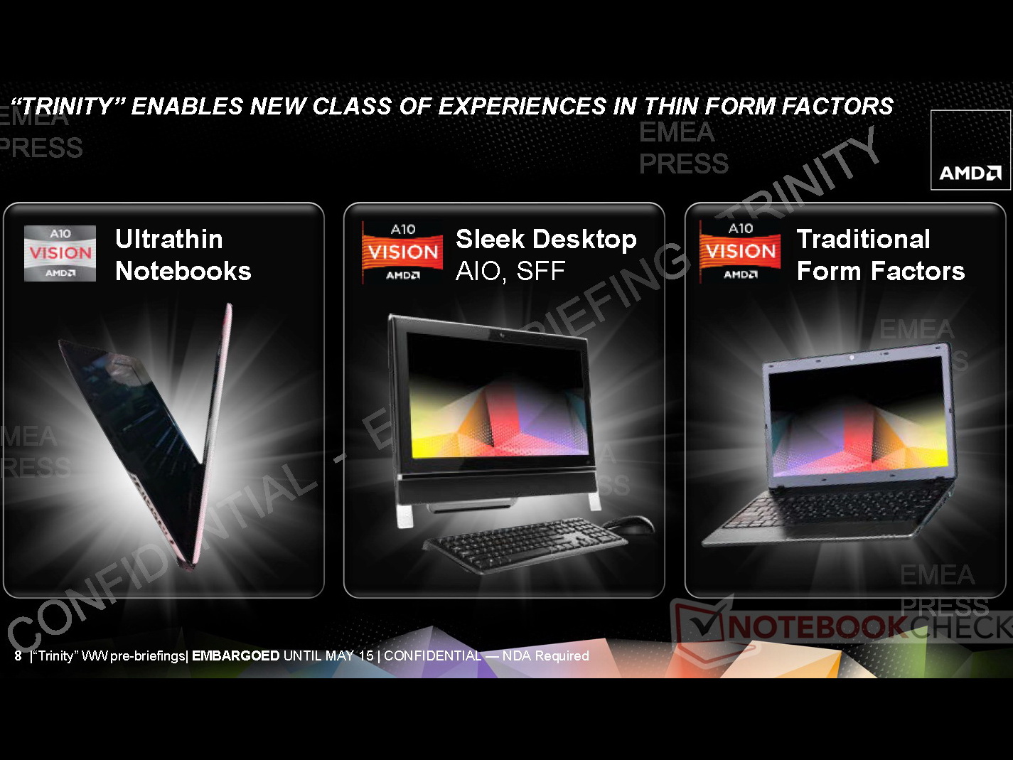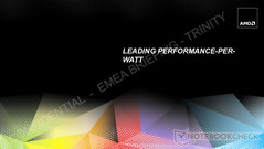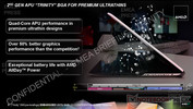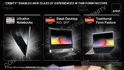 Der superflache 3,6-mm-LCD darf inklusive LCD-Rahmenkonstruktion auf eine Bauhöhe von 5,5 Millimetern kommen. Für die Ultrathin-Bodengruppe setzt AMD mit 7-mm-HDD, Kernkomponenten und Akku eine Höhe von 12 Millimetern an. Insgesamt soll das Ultrathin mit Trinity-APU aber 18 Millimeter nicht überschreiten. Trotz der schlanken Bauform sollen Trinity-Notebooks hinsichtlich dem Leistung-per-Watt-Verhältnis sehr gut abschneiden.