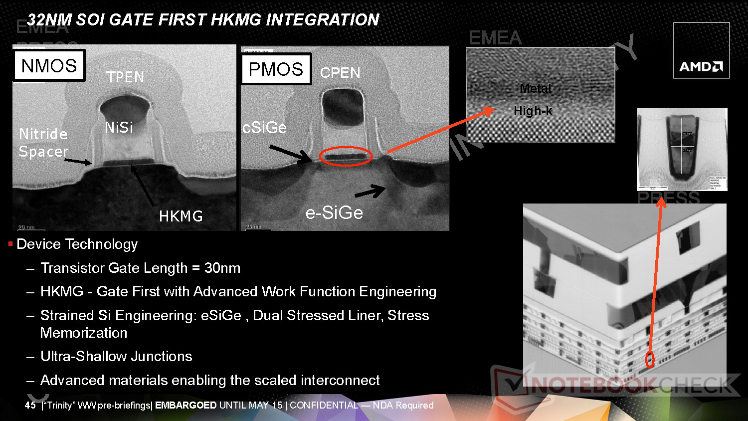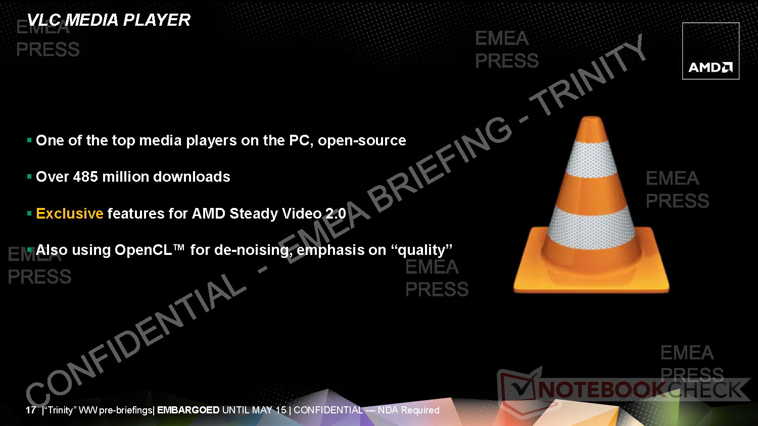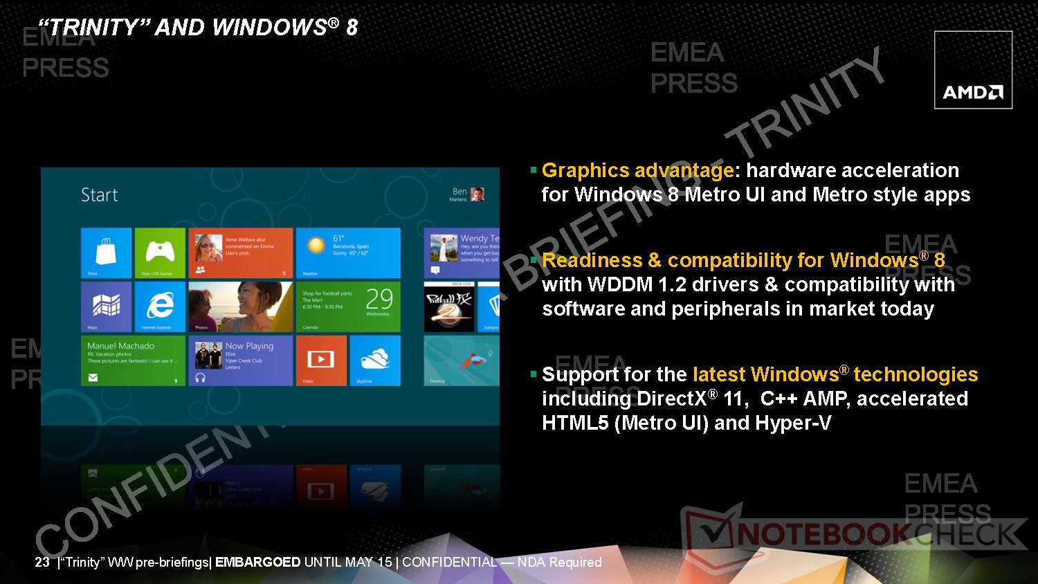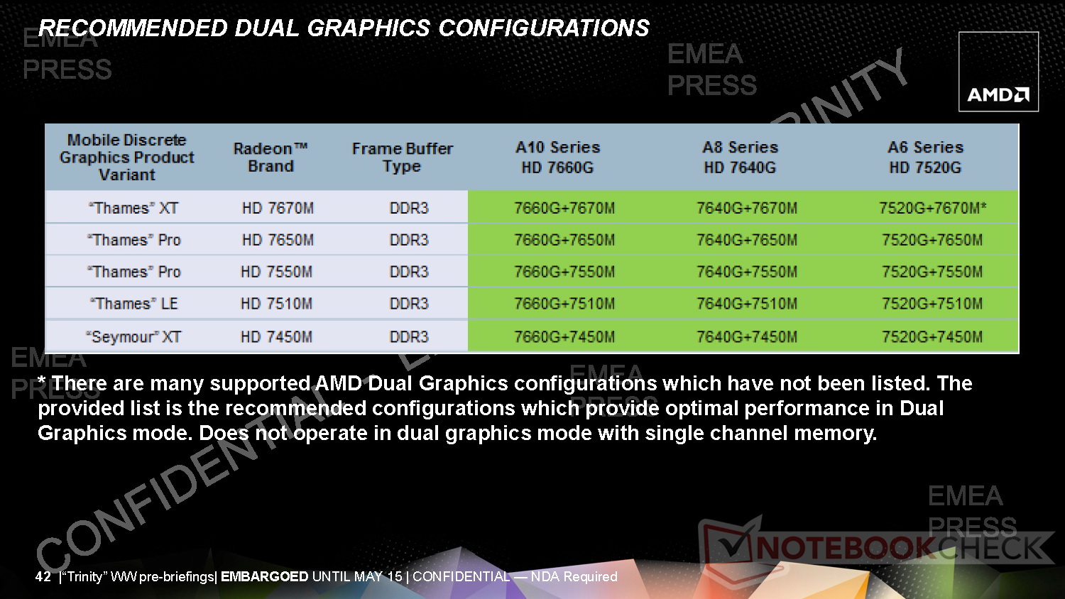 Der superflache 3,6-mm-LCD darf inklusive LCD-Rahmenkonstruktion auf eine Bauhöhe von 5,5 Millimetern kommen. Für die Ultrathin-Bodengruppe setzt AMD mit 7-mm-HDD, Kernkomponenten und Akku eine Höhe von 12 Millimetern an. Insgesamt soll das Ultrathin mit Trinity-APU aber 18 Millimeter nicht überschreiten. Trotz der schlanken Bauform sollen Trinity-Notebooks hinsichtlich dem Leistung-per-Watt-Verhältnis sehr gut abschneiden.