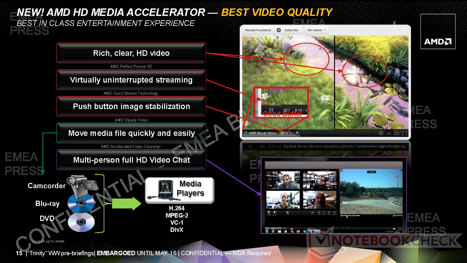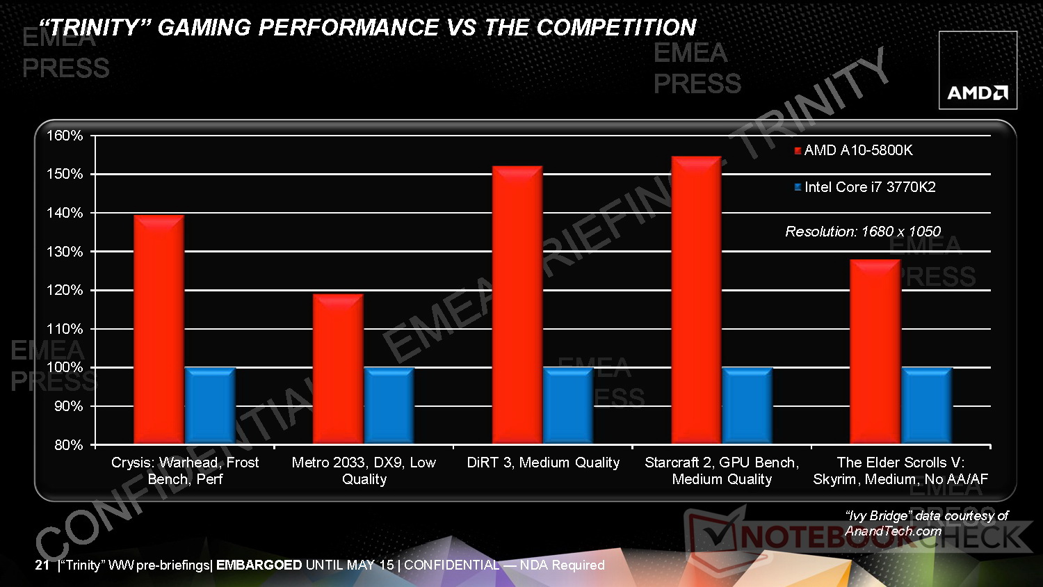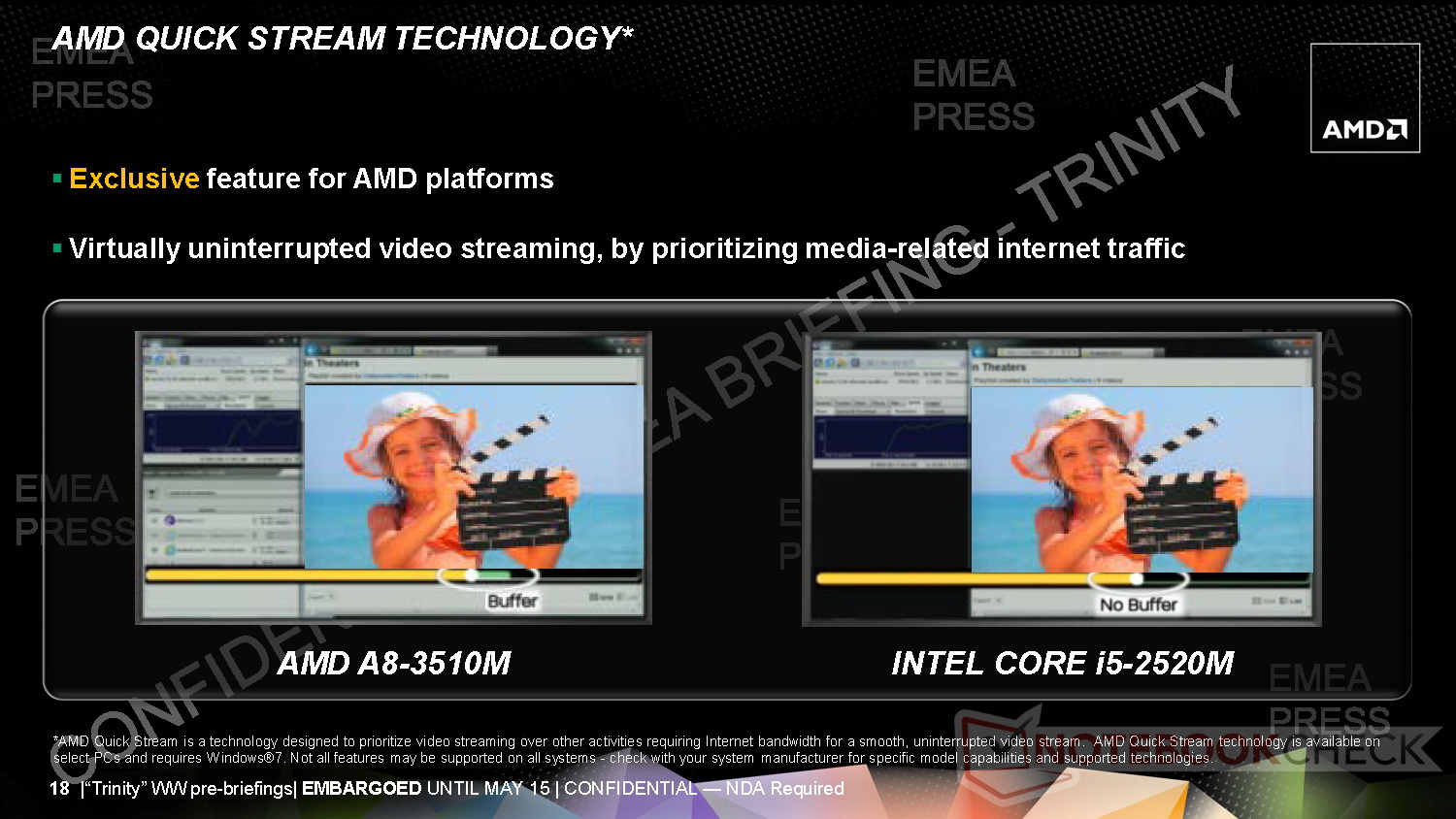 AMD bietet schon mit seinen bisherigen APUs bei Multimedia, HD-Inhalten und Games eine sehr gute Performance. Trinity soll auch in diesem Bereich mit Features wie AMDs "Quick-Stream-Buffer" für noch mehr Qualität, beispielsweise bei Videostreams sorgen. Für seinen A10-5800K vs. Intel Core i7-3770K2 attestiert AMD dank starker integrierter Radeon-GPU bei Tests mit Crysis: Warhead, Metro 2033, Dirt 3, Starcraft 2 und The Elder Scrolls V: Skyrim eine deutlich höhere Spieleleistung.