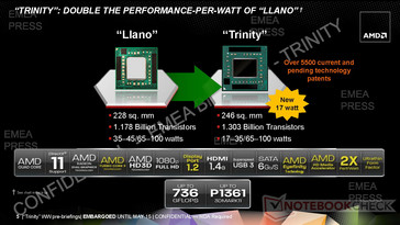 Mit Trinity feiert AMD heute die Evolution seiner APUs in nun 2. Generation. Trinity soll als neueste und sparsamere APU-Generation deutliche Fortschritte bei der Leistung für Multimedia und Gaming als auch beim Energieverbrauch erzielen. AMD will mit Trinity unter dem Strich die doppelte "Leistung-per-Watt" als Llano bieten. Während Llano auf einer Fläche von 228 Quadratmillimetern 1,178 Milliarden Transistoren vereint und mit TDPs von 35 bis 100 Watt arbeitet, benötigen die 1,303 Milliarden Transistoren von Trinity nun 246 mm². Neu mit Trinity: 17-Watt-APUs für Ultrathins.