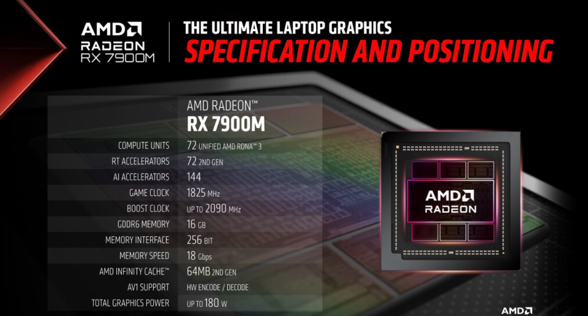 AMD spezifiziert eine Verlustleistung von bis zu 180 Watt, allerdings ist mit SmartShift eine noch höhere TGP möglich – im Alienware m18 kann die GPU so bis zu 200 Watt Strom verbrauchen. AMD positioniert die Radeon RX 7900M als Grafikchip für 1.440p-Gaming mit Ultra-Details, und somit als direkten Konkurrenten zur Nvidia GeForce RTX 4080 Laptop-GPU – laut AMDs eigenen Gaming-Benchmarks erreicht die Radeon RX 7900M im Schnitt eine 7 Prozent höhere Bildrate als die GeForce RTX 4080.