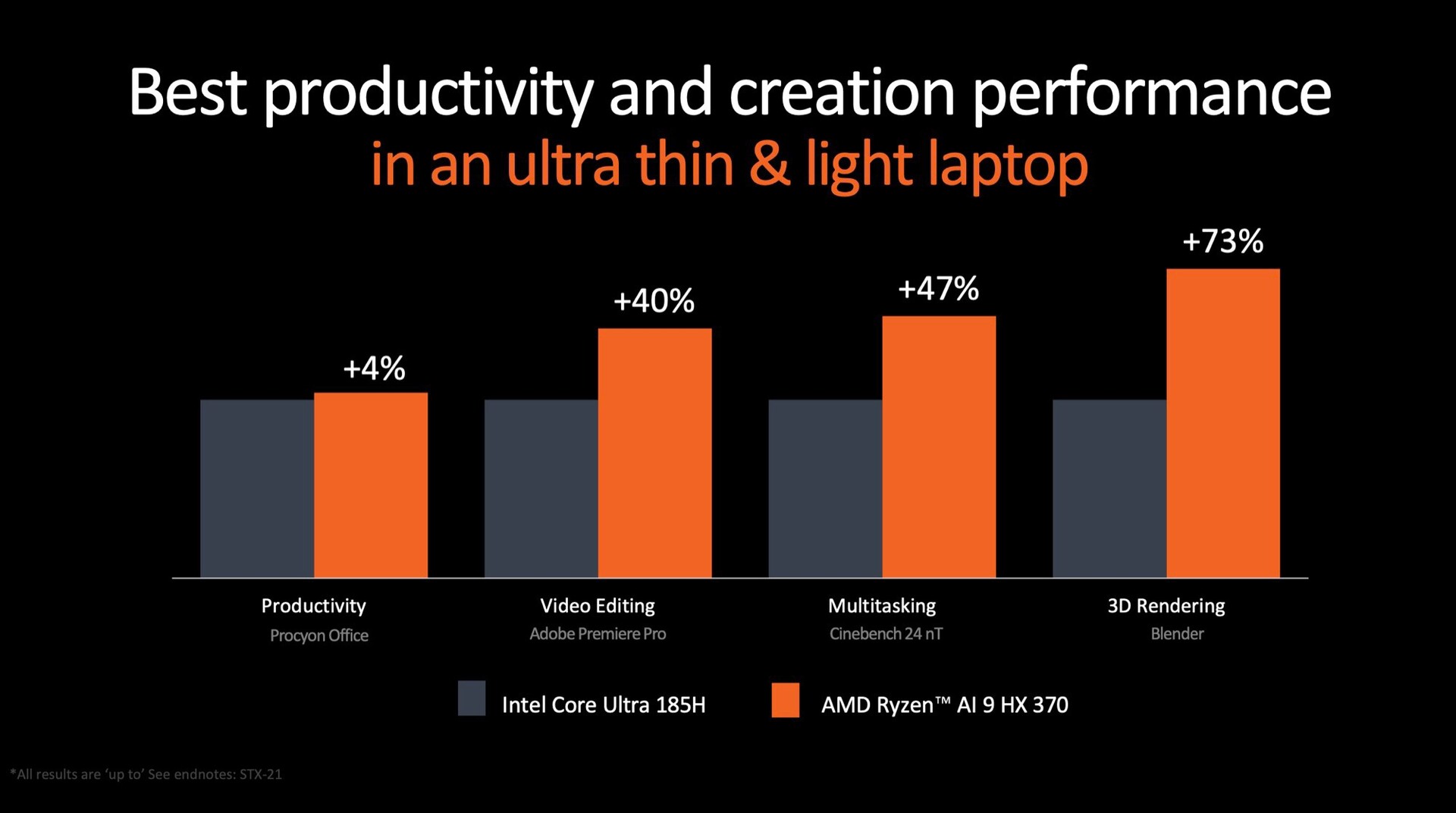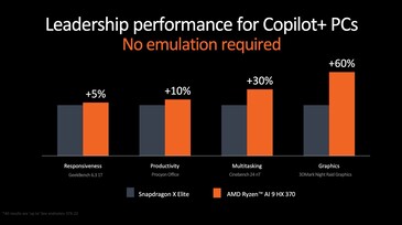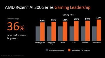 AMD hat bisher nur CPU-Benchmarks veröffentlicht, und verspricht dabei einen Vorsprung gegen alle relevanten Konkurrenten. Demnach soll der Ryzen AI 9 HX 370 beim Gaming zwischen 28 Prozent und 47 Prozent schneller als der Intel Core Ultra 9 185H sein, in Cinebench 24 bewirbt AMD sogar einen Vorsprung von 47 Prozent.