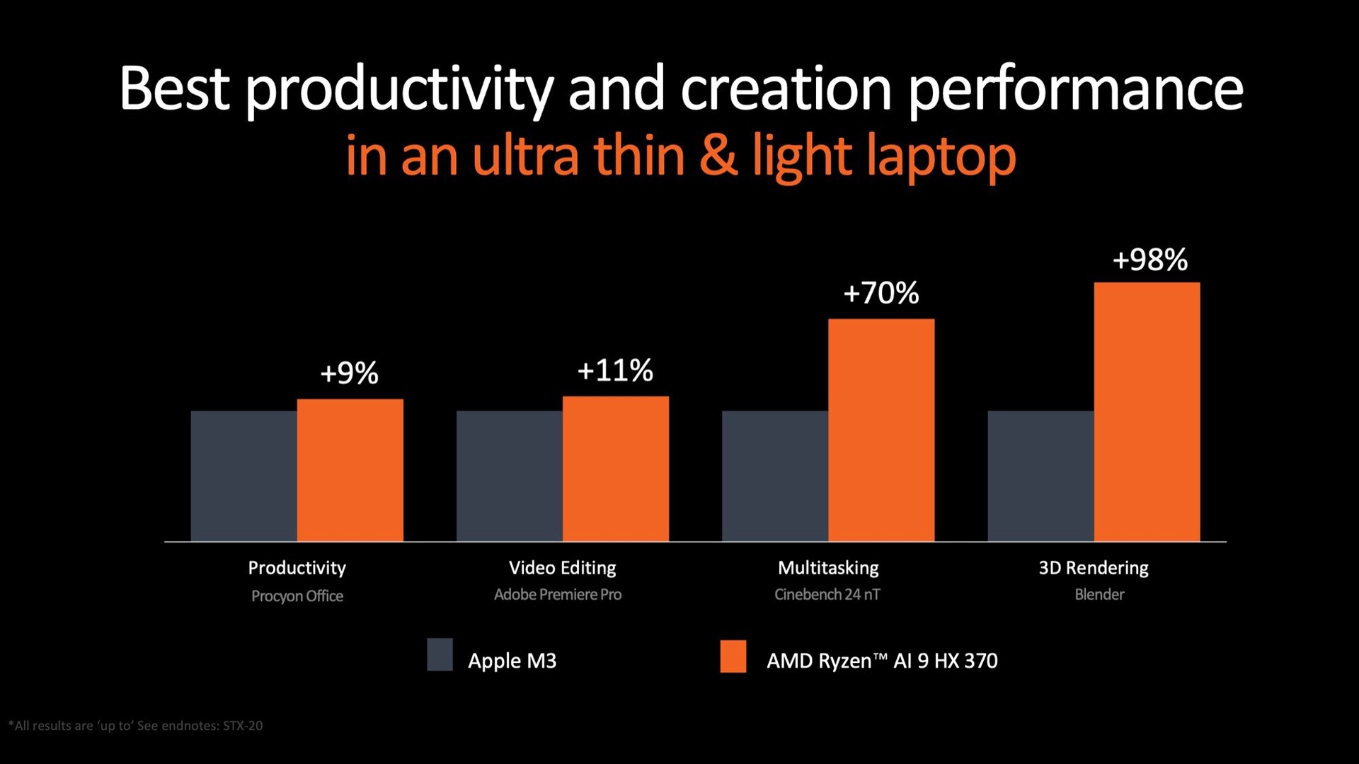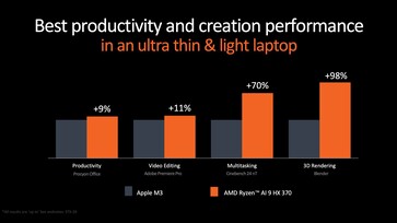 Der Apple M3 soll in Cinebench Multi-Thread um 70 Prozent übertroffen werden, der Qualcomm Snapdragon X Elite um 30 Prozent. Die Radeon 890M soll im 3DMark Night Raid Benchmark 60 Prozent schneller als der Grafikchip des Snapdragon X Elite sein, allerdings gilt wie üblich, dass die Benchmarks des Herstellers mit Vorsicht betrachtet werden sollten.