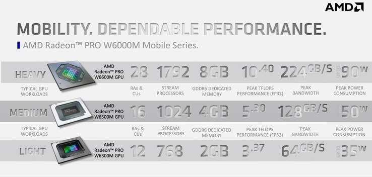 Zeitgleich hat AMD die Radeon Pro W6300M und die Radeon Pro W6500M vorgestellt, zwei neue Notebook-Grafikchips, die als günstigere Alternativen zur Radeon Pro W6600M positioniert werden. Die Radeon Pro W6300M kommt als neues Einsteiger-Modell mit 12 Compute Units, einer nominalen Performance von 3,37 TFLOPs, 2 GB GDDR6-Grafikspeicher und mit einer TGP von 25 Watt. Die Radeon Pro W6500M kommt dagegen mit 16 CUs, 5,3 TFLOPs, 4 GB GDDR6-VRAM und einer TGP von 35 bis 50 Watt.