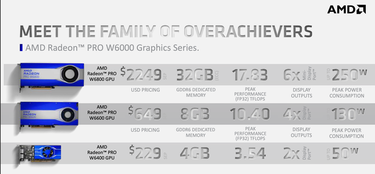 AMD positioniert die Grafikkarte als direkten Konkurrenten zur Nvidia T600, die trotz des etwas höheren Preises eine nominale Rechenleistung von nur 1,7 TFLOPs erreicht, während die Radeon Pro W6400 auf immerhin 3,54 TFLOPs kommt. Um diese Performance zu erzielen setzt AMD auf 12 Compute Units (CUs) auf Basis der aktuellen RDNA 2-Architektur.