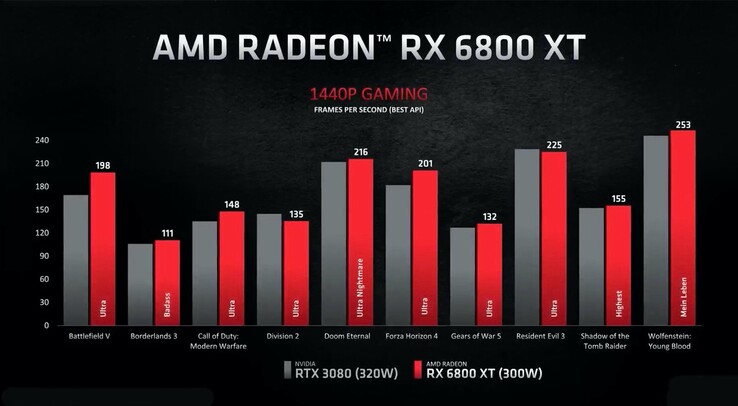 Die Radeon RX 6800 XT wird als direkter Konkurrent zur Nvidia GeForce RTX 3080 positioniert. Mit 72 Compute Units (CUs), Boost-Taktfrequenzen von bis zu 2.250 MHz und 16 GB GDDR6-VRAM soll die Grafikkarte die RTX 3080 in einer Vielzahl von Spielen übertreffen – AMDs eigenen Benchmarks zufolge erzielt die GPU in den meisten Titeln ein paar Bilder pro Sekunde mehr als der Konkurrent.