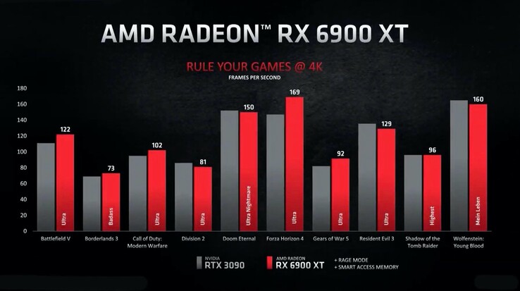 Die Radeon RX 6900 XT unterscheidet sich von der RX 6800 XT vor allem durch acht zusätzliche Compute units – die Taktfrequenzen, der Grafikspeicher oder auch die TGP sind identisch. Das reicht AMDs eigenen Benchmarks zufolge dennoch, um die GeForce RTX 3090 beim 4K-Gaming zu übertreffen. Auch hier sei aber angemerkt, dass die Raytracing-Leistung noch ungewiss ist, und dass diese Ergebnisse nur bei aktivem Rage Mode und Smart Access Memory erzielt wurden.