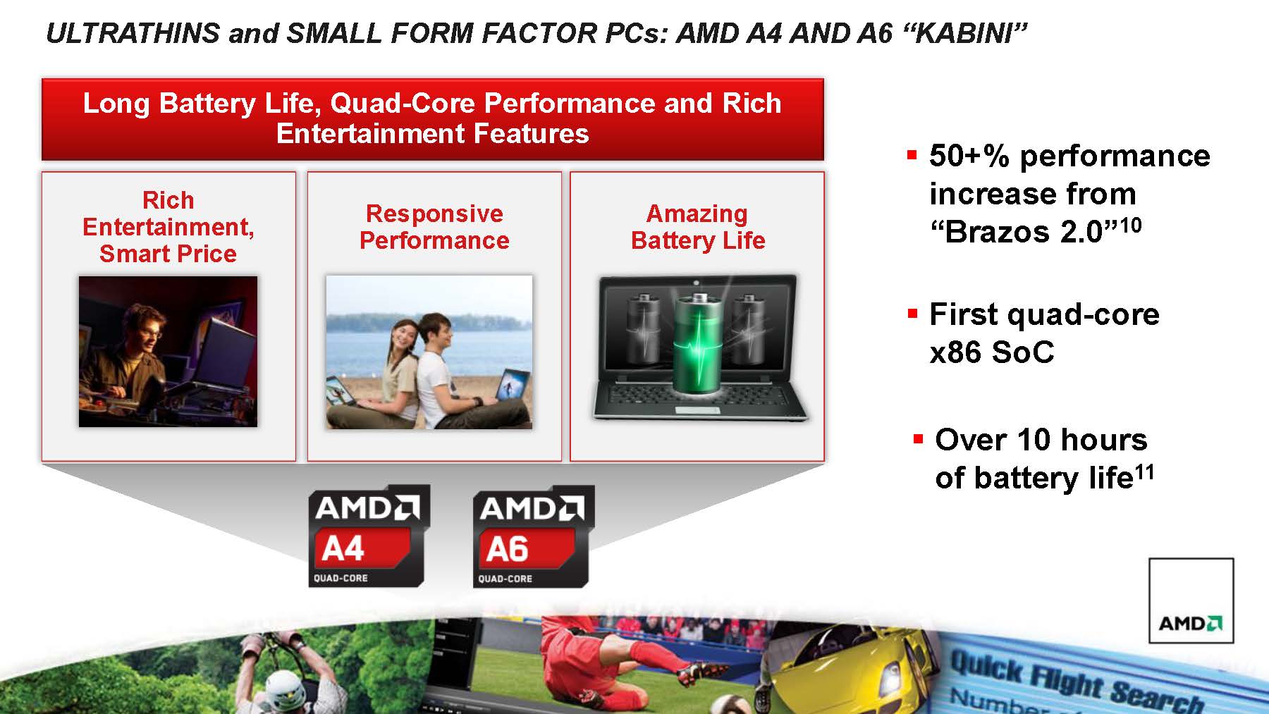 Die A-Serie und E-Serie APUs mit Codenamen Kabini (28nm) bezeichnet AMD als "echte" System-on-Chips (SoCs). AMDs A4 und A6 der Generation Kabini sollen mit einer geringen Energiesignatur (Low Voltage, 9 bis 15 Watt), 2 bis 4 "Jaguar"-Rechenkernen und GCN-Grafiklösungen aufwarten. AMD sspricht hier von 50 Prozent mehr Leistung, als bei Brazos 2.0 und eine Batterielaufzeit von mehr als 10 Stunden. Als erstes Modell hat AMD die A6-5200 APU mit AMD Radeon HD 8400 aufgeführt.