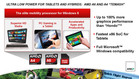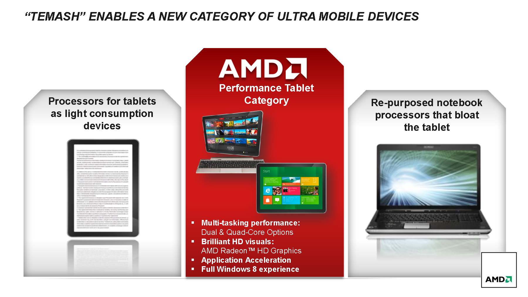 Mit den Ultra-Low-Voltage-SoCs (ULV) der A-Serie mit Codenamen Temash (28nm) will AMD eine neue Geräteklasse definieren: Performance Tablets. Die System-on-Chips der Temash-A6- und A4-Serien sollen doppelt so schnell wie die Z-Serie APUs mit Codenamen Hondo (Z-60) sein. Laut AMD sei Temash der aktuell schnellste x86-SoC für Tablets. AMD sützt sich dabei auf interne Test mit dem Temash A6-1450 Quad-Core (1,0 GHz) mit AMD Radeon HD 8280.