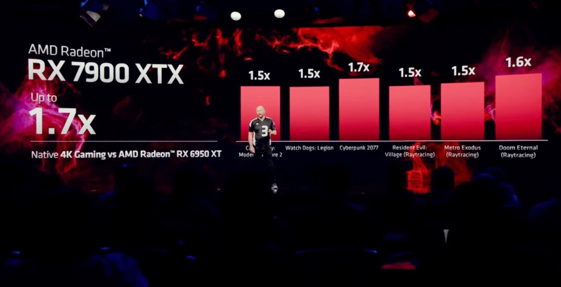Das neue Flaggschiff, die AMD Radeon RX 7900 XTX, erreicht eine nominale Rechenleistung von 61 TFLOPs – ein massives Upgrade im Vergleich zu den 23 TFLOPs der Radeon RX 6950 XT. Die Grafikkarte besitzt 96 Compute Units bei 2,3 GHz und 24 GB GDDR6-Grafikspeicher mit einer Bandbreite von 960 GB/s bei einer Total Board Power von 355 Watt. Im Vergleich zur Radeon RX 6950 XT ist die neue Grafikkarte laut AMD in der Praxis beachtliche 70 Prozent schneller, die Raytraicing-Leistung steigt um immerhin 60 Prozent.