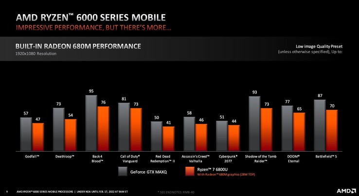 AMD behauptet, dass die neue iGPU praktisch jedes Spiel in 1.080p-Auflösung flüssig darstellen kann, auch wenn teilweise der Detailgrad reduziert werden muss. Um diese Behauptung zu stützen hat der Konzern einige Gaming-Benchmarks geteilt und dabei die Radeon 680M mit der Intel Iris Xe Graphics G7 und mit der Nvidia GeForce GTX 1650 Max-Q verglichen.