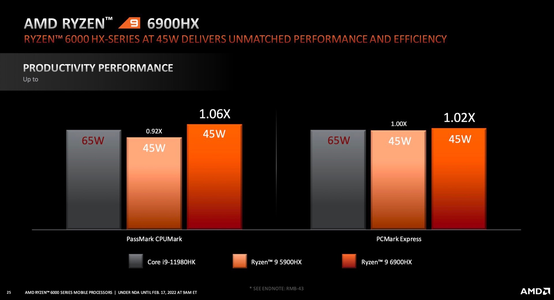 Der AMD Ryzen 9 6900HX soll bei 45 Watt eine bis zu 34 Prozent bessere Leistung erzielen als der Intel Core i9-11980HK bei 65 Watt. Die Vergleiche zu Intel Tiger Lake sind allerdings nicht mehr allzu relevant, nachdem Intel mit Alder Lake einen massiven Performance-Fortschritt erzielt hat – wer die bestmögliche CPU-Performance in einem Laptop benötigt sollte ausführlichere Tests von Ryzen 6000 abwarten.