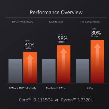 Alle drei Chips setzen auf Prozessorkerne auf Basis der Zen 2-Architektur, die erstmals mit Ryzen 3000 im Herbst 2019 zum Einsatz gekommen ist. Mit bis zu vier Kernen und acht Threads verspricht AMD eine passable Performance – im Vergleich zum Intel Core i3-1115G4 soll die Multi-Thread-Performance 58 Prozent besser ausfallen, allerdings dürfte der Vergleich zum neueren Intel Core i3-1215U deutlich kleinere Unterschiede zeigen.