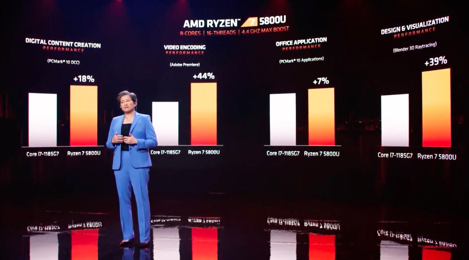 Die U-Serie ist wie gehabt für besonders dünne und leichte Notebooks gedacht, die TDP bleibt bei 15 Watt. Das neue Topmodell, der Ryzen 7 5800U, bietet mit acht Kernen, 16 Threads und Taktfrequenzen von bis zu 4,4 GHz im Vergleich zum Ryzen 7 4800U eine um 200 MHz höhere Boost-Taktrate sowie einen mit insgesamt 20 MB deutlich größeren Cache. Durch die Fortschritte der neuen Zen 3-Architektur dürfte die Leistung dennoch spürbar steigen.