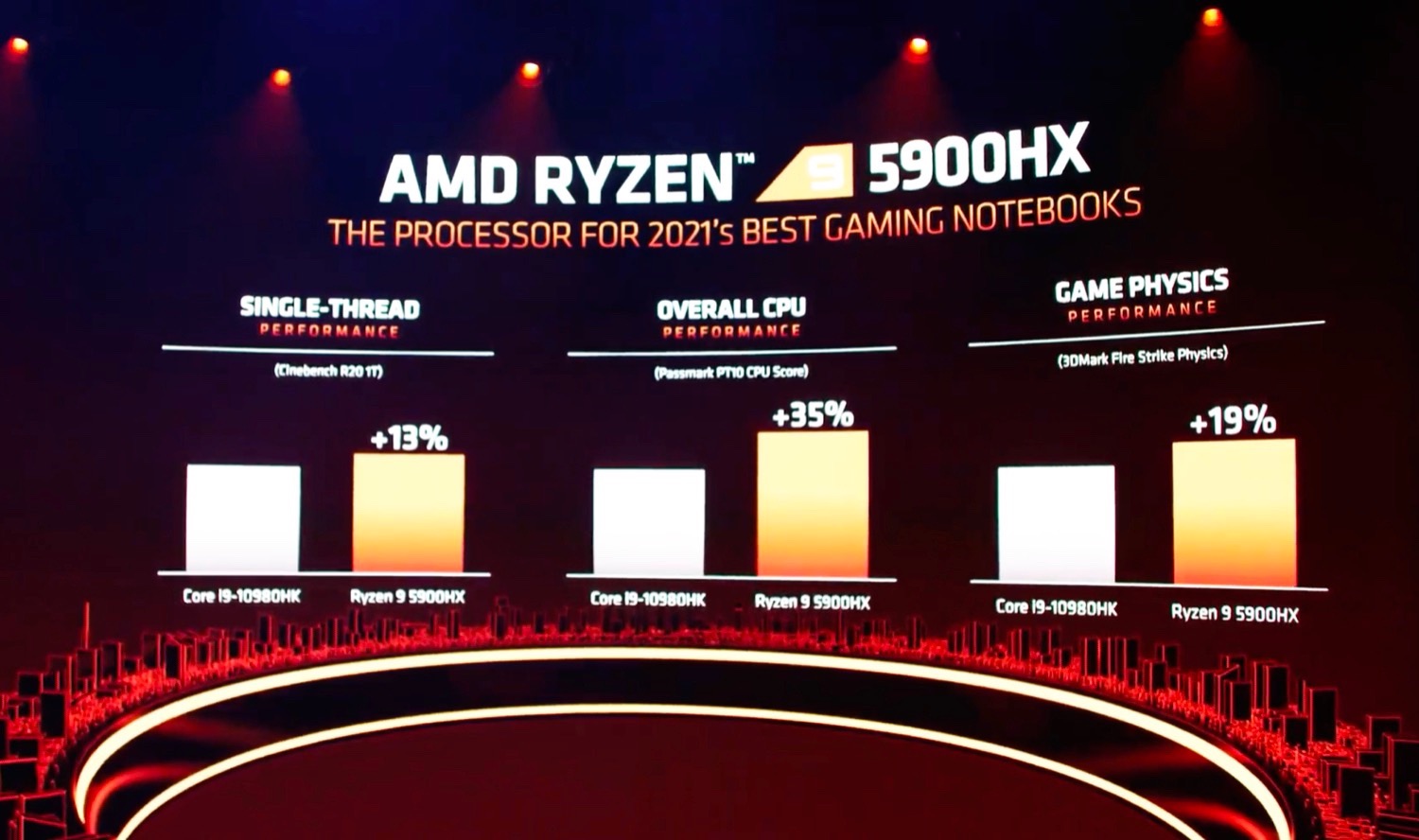 Zu den übrigen Chips liefert AMD keine konkreten Performance-Zahlen, wie erwartet setzen alle Ryzen 7- und Ryzen 9-Chips aber auf acht Kerne und 16 Threads, während sich der Ryzen 5 5600H und der Ryzen 5 5600HS mit sechs Kernen und zwölf Threads begnügen müssen. Alle Chips der H-Serie basieren auf der neuen Zen 3-Architektur.