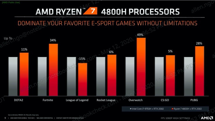 Die Spiele-Benchmarks waren ebenso aufschlussreich, wobei die Tests mit fast baugleichen Asus-Laptops durchgeführt wurden, und zwar mit einem ROG Zephyrus M GU502GV bei Intel und einem TUF Gaming FA506IV bei AMD. Die Pressemeldung schreibt im Kleingedruckten aber, dass ein AMD Ryzen 9 4900H getestet wurde, anders als die Benchmarks selbst, die klar von einem Ryzen 7 4800H sprechen – wir haben zur Klärung nochmals bei AMD nachgefragt. Update: Beim Kleingedruckten hat sich offenbar ein Tippfehler eingeschlichen, die Benchmarks wurden mit dem Ryzen 7 4800H durchgeführt.