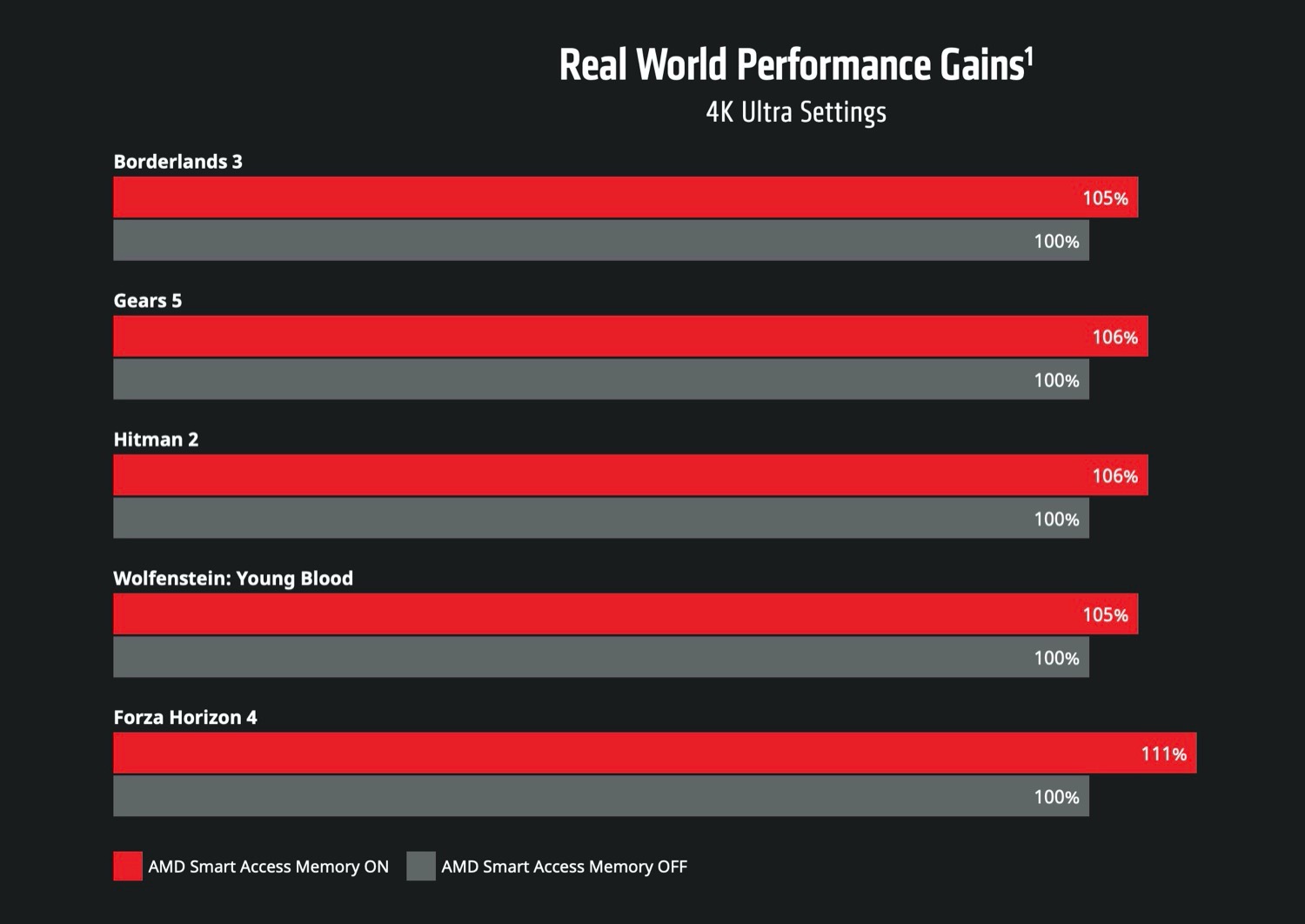 Demnach soll Smart Memory Access eine um fünf bis elf Prozent höhere Bildrate ermöglichen. Wie üblich sollte man diese Angaben allerdings mit etwas Vorsicht genießen: AMD dürfte Spiele ausgewählt haben, die in diesem speziellen Test einen besonders großen Performance-Sprung zeigen, ein umfassenderes Bild werden erst umfangreichere, unabhängige Tests liefern.