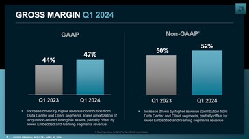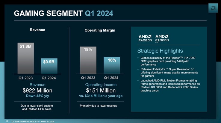 Im Gaming-Segment fällt AMD weiter hinter Nvidia zurück – während Nvidia GeForce im ersten Quartal 2024 Umsätze in Höhe von 2,24 Milliarden US-Dollar erwirtschaftet hat, was einem Rückgang in Höhe von 38 Prozent im Vergleich zum selben Zeitraum im Vorjahr entspricht, musste AMD sogar einen Umsatzeinbruch um 48 Prozent auf 922 Millionen US-Dollar verzeichnen.