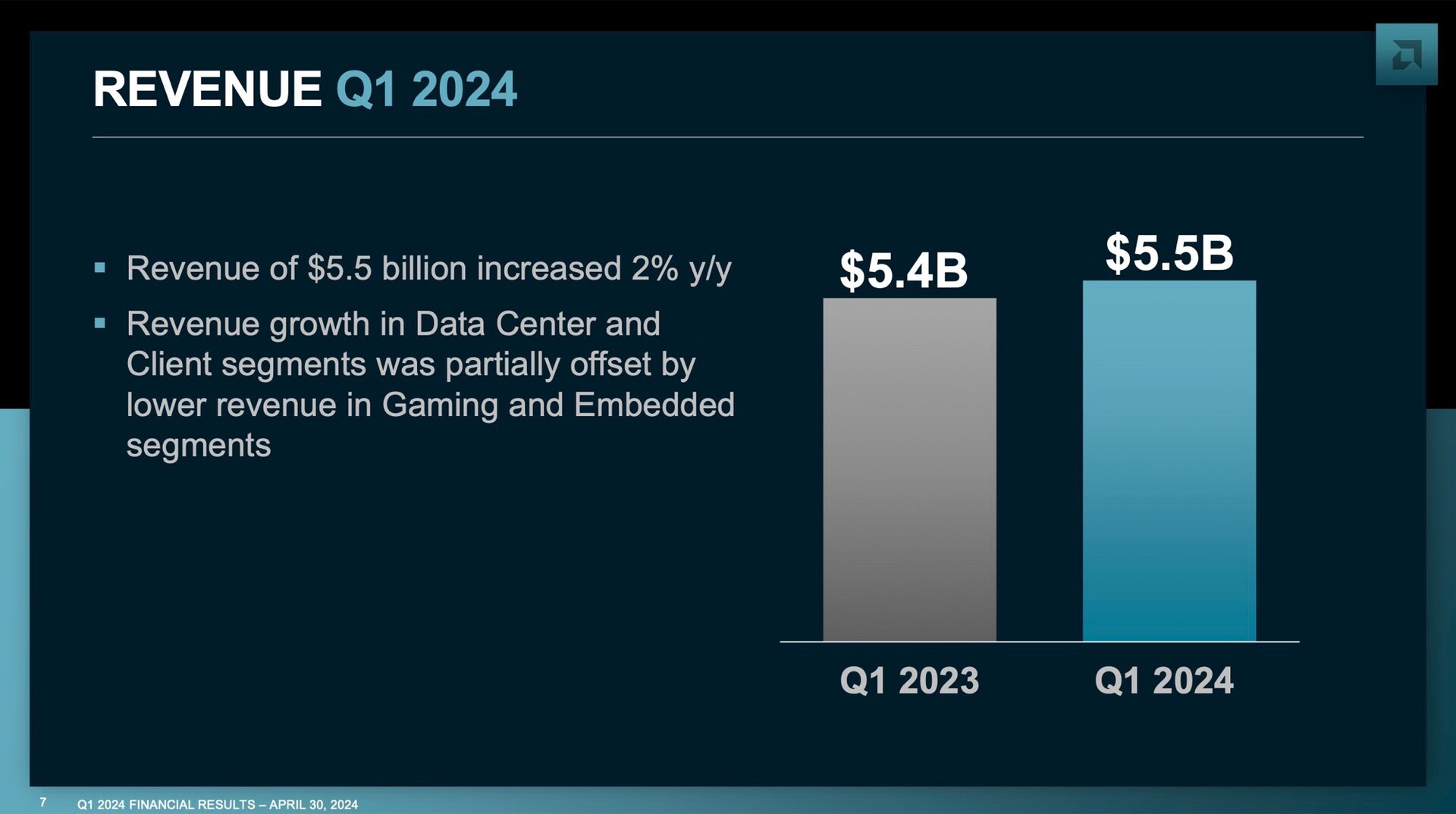 AMD hat die Finanzergebnisse für das erste Quartal 2024 veröffentlicht, und damit die Umsätze bestätigt, die vom Januar bis zum März 2024 erwirtschaftet wurden. Demnach konnte AMD den Umsatz im Vergleich zum ersten Quartal 2023 um 2 Prozent auf 5,47 Milliarden US-Dollar erhöhen, die Bruttomarge steigt um 2 Prozentpunkte auf 52 Prozent, der Gewinn konnte immerhin um 3 Prozent auf 1,13 Milliarden US-Dollar erhöht werden.