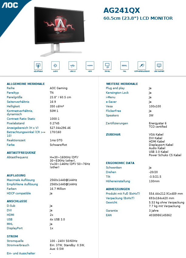 Beide Monitore setzen zudem auf die AOC Flicker-Free-Technologie, die Bildschirmflackern stark reduziert und so Müdigkeit sowie Reizungen der Augen vorbeugen soll. Der AG241QX verfügt darüber hinaus über den Low-Blue-Light-Modus, der die schädlichen, kurzen, blauen Lichtwellen reduzieren soll, ohne dabei die Farbqualität zu beeinträchtigen. Der Agon AG241QX besitzt als Eingänge D-Sub, DVI, HDMI, MHL, Displayport und unterstützt USB-Fast-Charge.