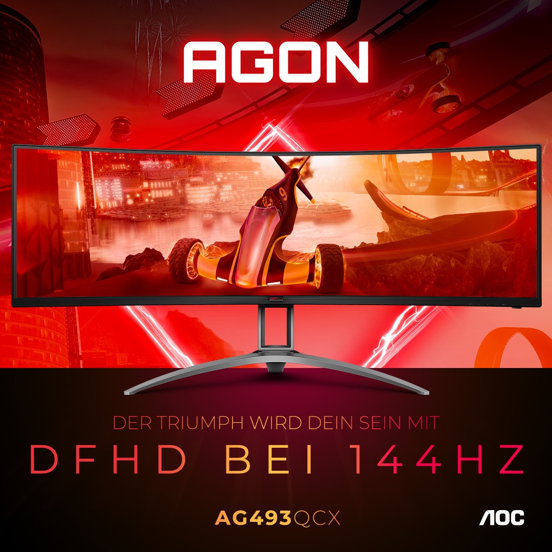 Der neue AOC AG493QCX ist ein 49 Zoll großer und gewölbter (1800R) Gaming-Monitor. Er ist mit einem VA-Panel ausgestattet, das mit Dual FHD (DFHD), also 3.840 x 1.080 Bildpunkten im Seitenverhältnis 32:9 auflöst. Die Bildwiederholungsrate beträgt 144 Hz. Die Reaktionszeit liegt bei 4 ms (GtG) sowie 1 ms (MPRT).