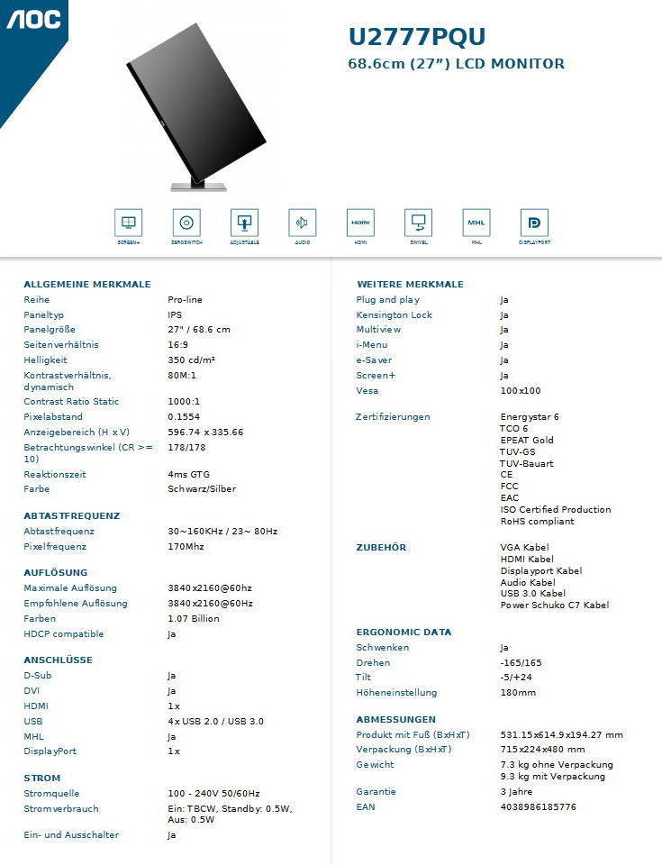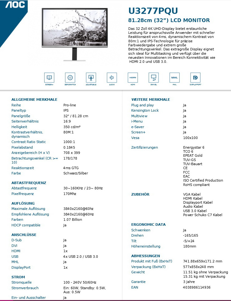 AOC spendiert seinen Monitoren U2777PQU und U3277PWQU zudem ergonomische Einstellmöglichkeiten wie eine Höhenverstellbarkeit, Schwenken, 90°-Drehung (Pivot) und eine Kippfunktion. Die AOC Flicker-Free-Technologie soll Bildschirmflackern reduzieren. Beide Displays bieten als Anschlüsse DisplayPort, HDMI 2.0, DVI und VGA sowie einen USB-3.0-Hub für schnelle Datenübertragungen und das schnelle Aufladen von Akkus mobiler Geräte mit.