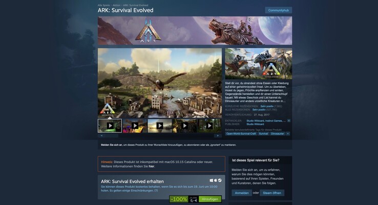 ARK: Survival Evolved kann ab sofort bis zum 19. Juni um 10:00 Uhr kostenlos auf Steam heruntergeladen werden, statt der 24,99 Euro, die auf Steam normalerweise für ARK fällig werden. Das Spiel läuft nicht nur auf Windows, sondern auch auf macOS, SteamOS und Linux.