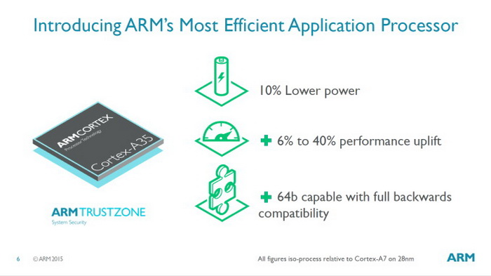 Chipschmiede ARM hat den ersten Vertreter aus der Familie von neuen und sehr energiesparenden und 64 Bit fähigen ARMv8-A Applikationsprozessoren (AP) angekündigt: ARM Cortex-A35. Der Cortex-A35 soll als kleinster und sparsamster CPU-Vertreter seiner Klasse vor allem im Embedded-Bereich, in Set-Top-Boxen, Smart-TVs, Low-Power-Servern sowie der "nächsten Milliarde" von Entry-Level-Smartphones zum Einsatz kommen.
