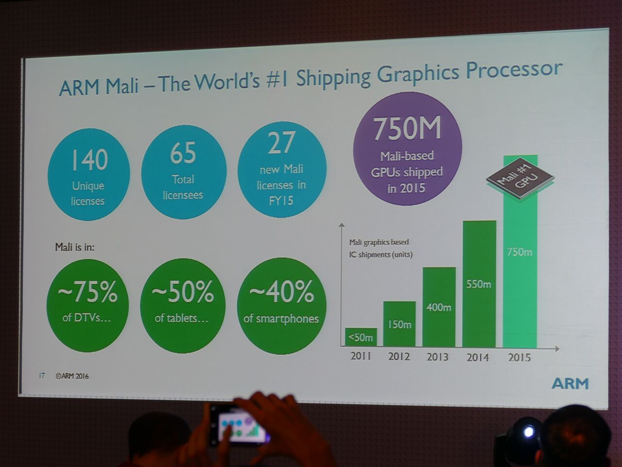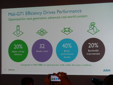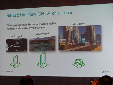 Das ist natürlich insbesondere für VR-Anwendungen wichtig. Auch die neue Mali G71-GPU soll explizit für VR optimiert sein und so beispielsweise 4K-Displays, wie das bereits auf der Display Week als Prototyp gezeigte Samsung 4K-Display mit bis zu 120 Hz unterstützen. Die neue Grafikeinheit wird sogar bis zu 50 Prozent schneller als die diesjährige Mali-T880 und soll dabei 20 Prozent energiesparender sein. Dies wurde unter Anderem durch die neue Bitfrost-Architektur erreicht, welche mit bis zu 32 integrierten Shadern die doppelte Anzahl im Vergleich zum Vorgänger mitbringt.