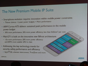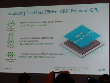 ARM hat heute auf der Computex 2016 die Basis für die nächste SOC-Generation für 2017 vorgestellt. Das Top-Modell ist der Nachfolger des Cortex-A72, welcher auf 16 nm Prozess basiert und bis zu 2,5 Ghz erreichen kann. Der neue Cortex-A73 wird dagegen bereits im 10 nm FinFet-Verfahren produziert und kann daher mit 2,8 GHz nicht nur um 30 Prozent mehr Leistung entfalten, auch der Stromverbrauch konnte deutlich gesenkt werden. Zudem verspricht ARM, dass die gesamte Leistung im Gegensatz zum Vorgänger, nicht nur kurzfristig als Peak-Performance zur Verfügung steht sondern permanent. Im Vergleich zum SOC-Design von 2015 (Cortex-A57, beispielsweise im Qualcomm Snapdragon 810 SOC) ist sogar mehr als das doppelte der Leistung drin.