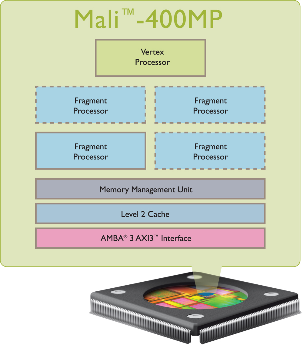 Der ARM Mali-400 MP4 ist eine OpenGL ES 2.0 fähige Grafikkarte für ARM SoCs (System on a Chip). Daher ist er vor allem für den Einsatz in Tablets und Handy gedacht in Verbindung mit mobilen Betriebssystemen wie Android. Der MP4 ist die Version mit vier Kernen (sogenannten Fragment Processors) und einem Vertex Prozessor. Die Leistung soll etwas unter einem PowerVR SGX 543MP2 liegen laut ARM (bei vollen 4 Fragment Prozessoren wahrscheinlich).