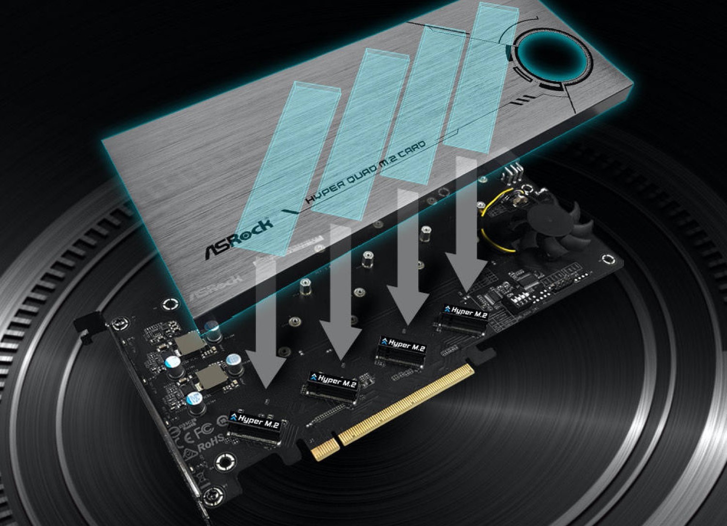 Für die notwendige Kühlung sorgt das Aluminiumgehäuse mit den vier großen Thermopads, welche die Performance der SSDs in Kombination mit dem per Software frei steuerbaren, 5 Zentimeter großen Lüfter sicherstellen sollen. Durch einen Onboard-Switch können bis zu vier Hyper Quad-Karten gleichzeitig verwendet werden, um maximal gleich 16 M.2-SSDs per PCIe zu verbinden. ASRock hat noch keine Details zu den Preisen und zur Verfügbarkeit verraten, alle technischen Daten gibt es aber auf der Webseite des Unternehmens nachzulesen.