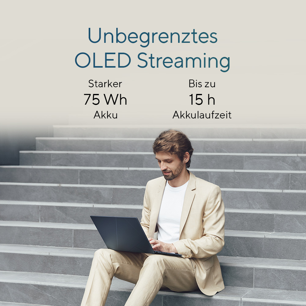 ASUS verbaut im Zenbook 14 OLED einen 75 Wh großen Akku für bis zu 15 Stunden Laufzeit. Er weist nach 1.200 Ladezyklen noch 70 Prozent Leistungsfähigkeit auf. Auch die zu 100 Prozent recyclebare Verpackung, 50 Prozent recyceltes Plastik im Laptop sowie ein um 50 Prozent verringerter CO2-Ausstoß machen das Zenbook 14 OLED besonders nachhaltig.