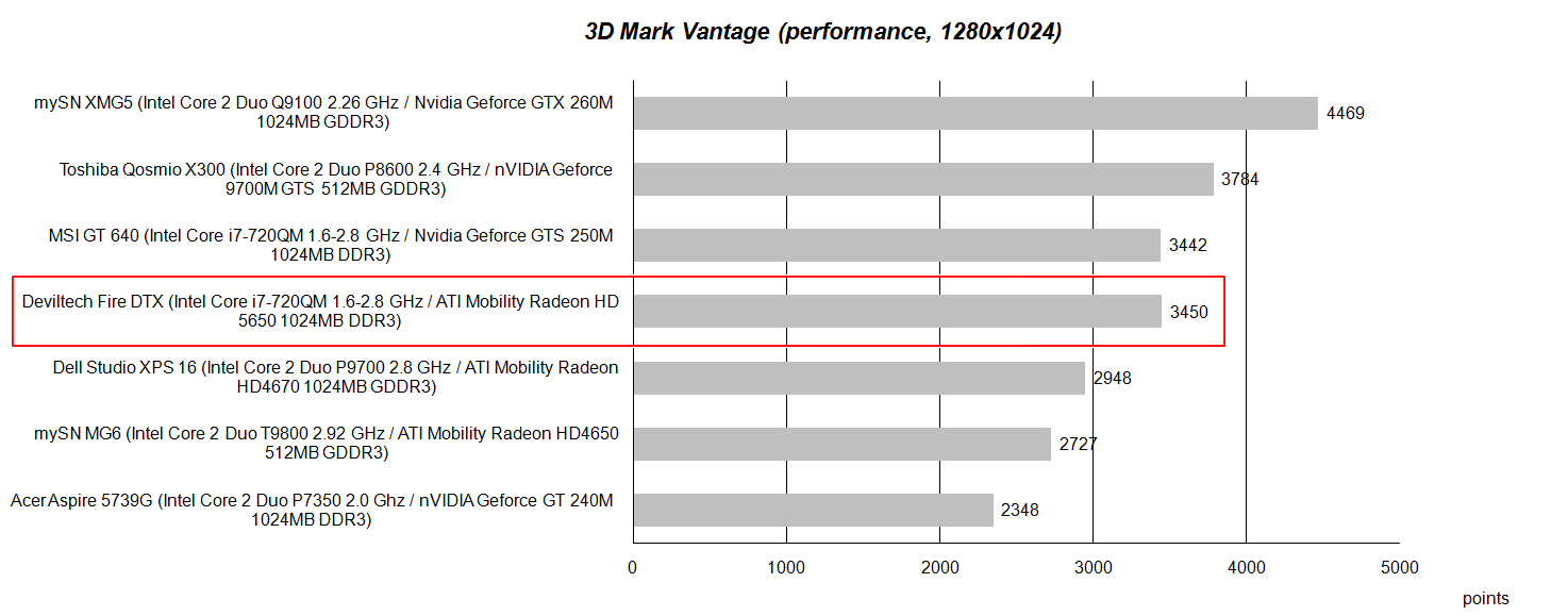 Eine weitere Möglichkeit einer Leistungseinteilung der HD 5650 bietet der aktuelle 3D Mark Vantage, ebenso aus dem Hause Futuremark. Wenn auch das Feld hier deutlich näher zusammen rückt, ändert sich letztlich letztlich kaum etwas an der Reihenfolge der getesteten Geräte. Mit 3450 Punkten egalisiert die getestete ATI HD 5650 allerdings das Ergebnis der Nvidia GTS 250M aus dem MSI GT 640 Notebook, das mit einem vergleichbaren Formfaktor antritt. Hier werden erst die praktischen Benchmarks zeigen, wer letztlich wirklich die Nase vorne hat.