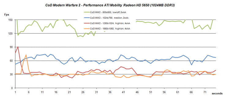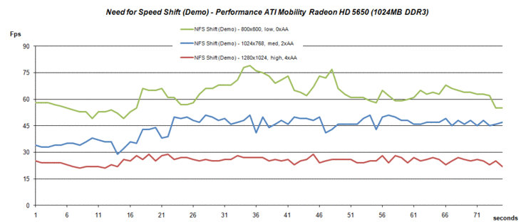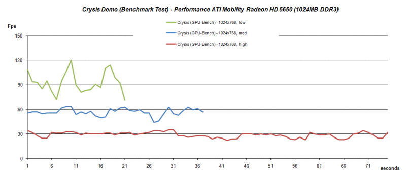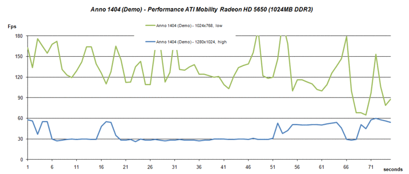 Mit den erreichten 44 Fps bei hohen Grafikanforderungen spielt die ATI HD 5650 in der obersten Liga mit. Selbst die Ergebnisse von reinrassigen Gaming Boliden, etwa dem MSI GT725 mit ATI HD4850 von 46 Fps oder des mySN XMG5 mit Geforce GTX 260M Grafik von Nvidia (42 Fps) positionieren sich nur unweit der HD 5650.