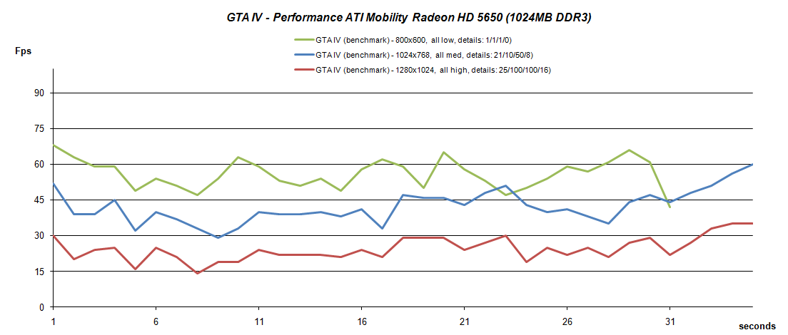 Die HD5650 liegt damit deutlich über dem Niveau der ATI HD 4650 die sich bei mittlerer Detailstufe bei rund 29 Fps einordnet. Knapp voran bleibt die GTX 260M von Nvidia welche sich in selbiger Disziplin rund 48 Fps bringt.