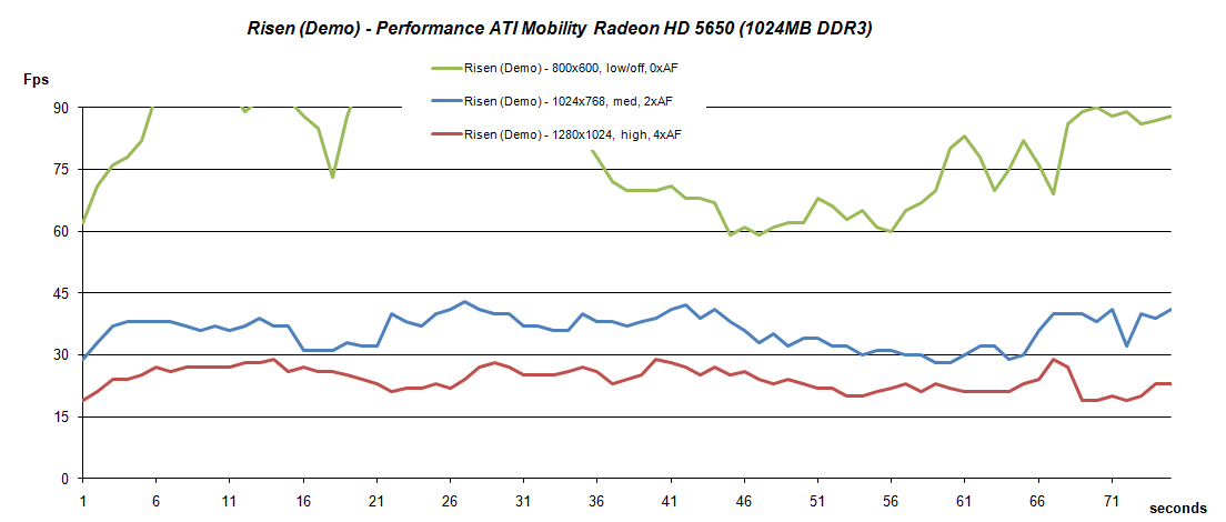 Bei einer Auflösung von 1024x768 Pixel und mittleren Grafikeinstellungen lieferte die HD5650 im Schnitt gute 57 Frames pro Sekunde. Ein Anheben der Detailstufe auf High brachte allerdings umgehend auch ein Absinken der Framerate auf unter 30 Fps mit sich. Das Fps-Diagramm zeigt hier einen sehr konstanten Verlauf knapp über bzw. unter der 30 Fps-Marke. Subjektiv wirkte das Bild ausreichend flüssig, im praktischen Gameplay sollte man aber etwas zurückstecken, um Reserven bei diversen Effekten zu haben.