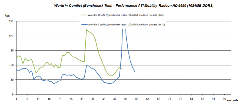 Bei einer Auflösung von 1024x768 Pixel und medium Details (DX9) lieferte die HD 5650 gute 95.1 Fps. Deutlich weniger aber immer noch ausreichend für eine absolut flüssige Bilddarstellung waren es bei hohen Grafikdetails, sprich DirectX 10. Hier kam unser Testsystem im Schnitt auf 44.7 Fps. Ein Blick auf den Verlauf der Bildwiederholungsrate zeigt allerdings auch ein Abrutschen auf bis zu unter 30 Fps. Da WiC jedoch als Strategiespiel nicht nach sehr hohen Frameraten verlangt, ist dieser Einbrauch vernachlässigbar.