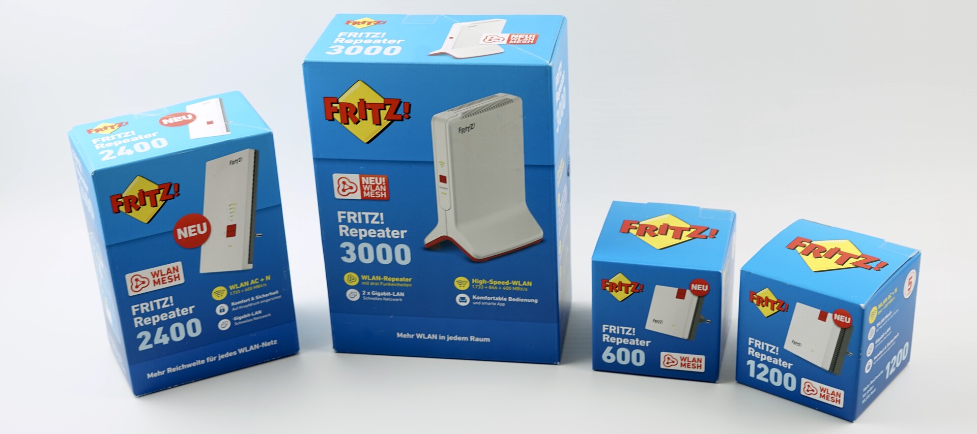 Please Repeat! Mit der Fritz!WLAN Repeater Familie bietet AVM eine Reihe von kleinen Geräten zur schnellen und einfachen Erweiterung der Reichweite des WLAN-Netzwerkes an. Im Test betrachten wir die vier neuen und einen Repeater der älteren Serie und klären welcher sich für welchen Einsatz eignet.