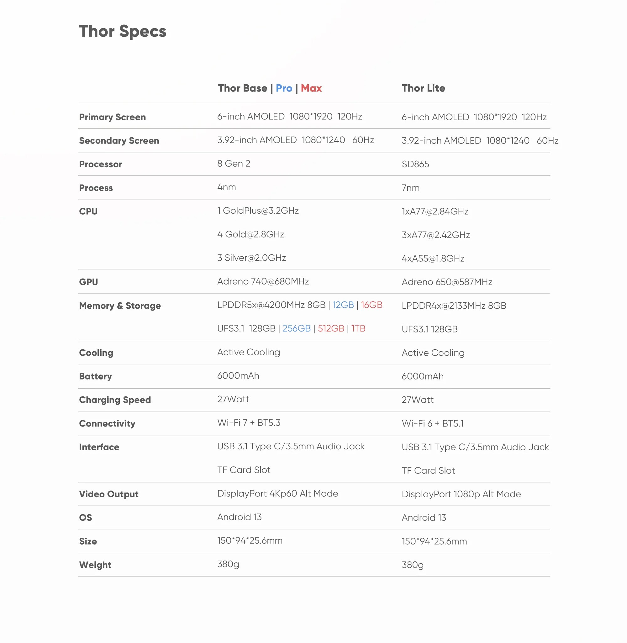 Die Änderung des Speichertyps betrifft beim Thor die Varianten mit Snapdragon 8 Gen 2. Dazu zählen der Thor Base mit 8 GB RAM und 128 GB Speicher, der Thor Pro mit 12 GB RAM und 256 GB Speicher sowie der Thor Max mit 16 GB RAM und 512 GB Speicher. Der Thor Lite mit Snapdragon-865-Prozessor nutzt bereits UFS-3.1-Speicher und bleibt unverändert.