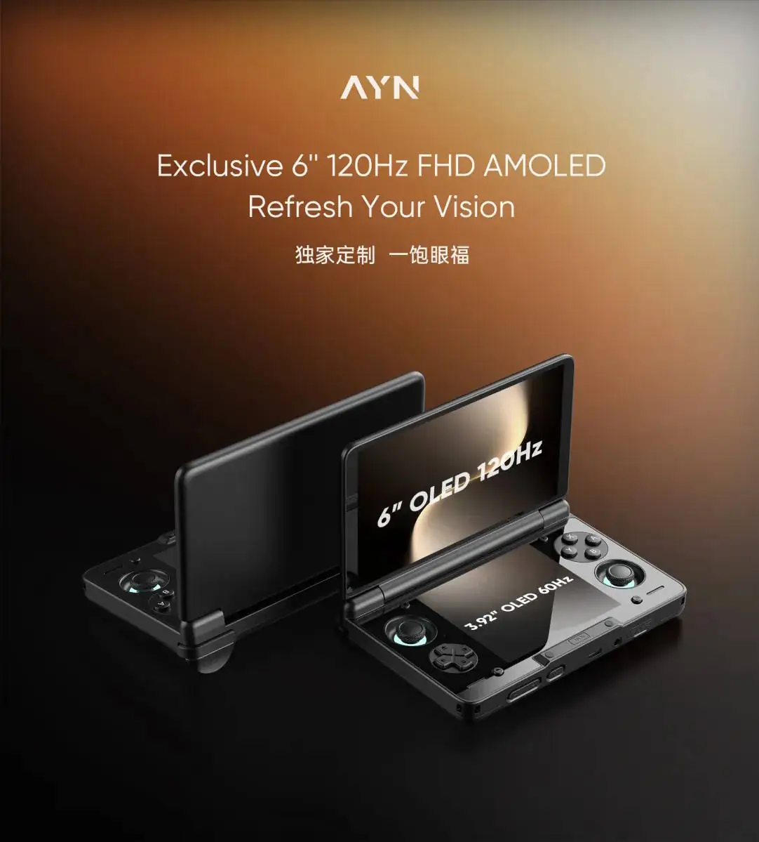 AYN verbaut ein OLED-Panel mit einer Bildfrequenz von 120 Hz. Das 3,92 Zoll Zweitdisplay basiert ebenfalls auf einem OLED-Panel, allerdings mit einer Bildfrequenz von nur 60 Hz. Mit einem 8:7-Seitenverhältnis dürften beim Zocken von 3DS-Spielen oben und unten schmale schwarze Balken zu sehen sein. Während AYN die exakten Maße noch nicht bestätigt hat, dürfte der AYN Thor im Hinblick auf die Display-Größen und die schmalen Bildschirmränder etwas kompakter als ein Nintendo 3DS XL ausfallen.