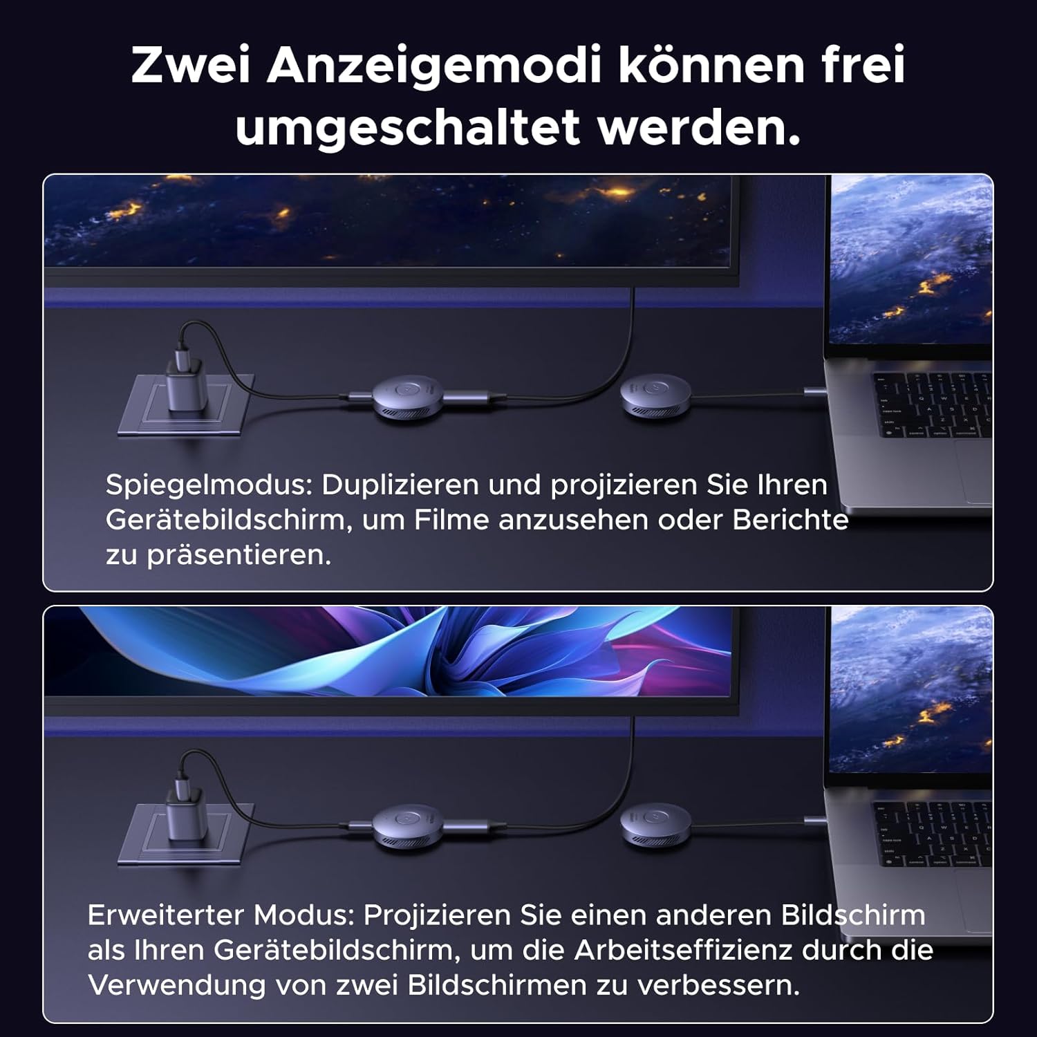 Für die Datenübertragung wird ein WiFi-Netzwerk im 5-GHz-Band aufgespannt. Die Sender-Einheit kann via MagSafe etwa an ein Smartphone befestigt werden. Der Zuspieler muss dabei natürlich die Bildausgabe über USB Typ (DisplayPort) unterstützen. Der Zuspieler kann über USB Typ C gleich mit bis zu 30 Watt versorgt werden. Angegeben wird eine Reichweite von bis zu 50 Metern. Die Auflösung ist auf 1.080p bei 60 Hz limitiert, was bei Präsentationen weniger problematisch als bei der Wiedergabe von Videospielen problematisch sein dürfte.