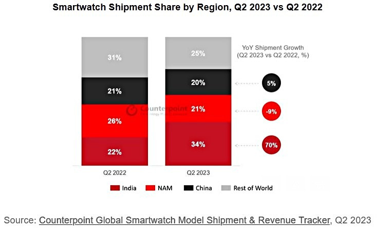 Während Samsung schwächelt, hat die indische Marke Noise die weltweite Smartwatch-Welt praktisch über Nacht erobert. Zwar verzeichnet die im Jahr 2014 gegründete Firma von Amit und Gaurav Khatri seit Jahren ein steiles Absatzwachstum, jetzt hat Noise aber im 2. Quartal mit einem beeindruckenden Wachstum von 86 % YoY sogar Samsung aus der Top 3 gekickt. Die Noise ColorFit Icon Serie allein trägt zu stolzen 28 % der Gesamtlieferungen bei. Die Noise ColorFit Pulse 3 mit 1,96"-Display, Bluetooth 5.3 und 24/7-Herzfrequenzmessung kostet bei Amazon India umgerechnet nur 18 Euro (1.599 INR). Auch die indische Marke Fire-Boltt schaffte ein tolles Wachstum von 70 % (YoY), für die Top 3 reichte es aber nicht.