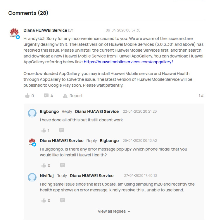 Einige Nutzer merken sicher nicht zu Unrecht an, dass die Wearables zuvor funktionierten, auch ohne die Health App über die AppGallery installiert zu haben. Dies sei erst vor Kurzem nötig geworden – warum? Andere Nutzer haben den Vorschlag angenommen und ausgeführt, berichten aber auch weiterhin über anhaltende Verbindungsprobleme zwischen App und Wearable auf Smartphones, welche nicht von Huawei stammen.