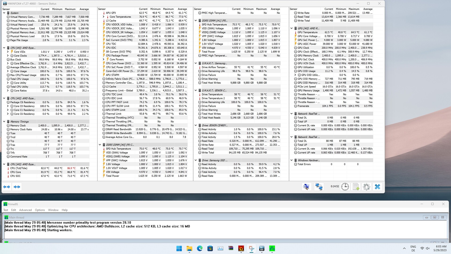 Aufgrund der Materialauswahl erwärmt sich das Gehäuse des Ace Magician AM08 Pro nicht sehr stark. Im Bereich der Lüfterauslässe sehen wir die höchsten Temperaturen, was jedoch zu erwarten war. Die beiden Lüfter können das SoC im Performance-Modus dauerhaft auf einem guten Leistungsniveau halten, das konnten wir bereits beim Test der Cinebench-R15-Multi-Schleife beobachten. Auch beim Stresstest sehen wir ähnliche Werte bei den Temperaturen. Maximal notieren wir 86,7 °C beim Prime95-Lasttest. Hier hätte man dem SoC noch etwas mehr Spielraum geben können, denn AMD gibt für den AMD Ryzen 9 6900HX eine tJMax von 95 °C an. Damit könnte das Gerät im Performance-Modus etwas leiser zu Werke gehen. In den beiden anderen Modi sehen wir weitaus geringere Temperaturen, aufgrund der gedrosselten TDP.