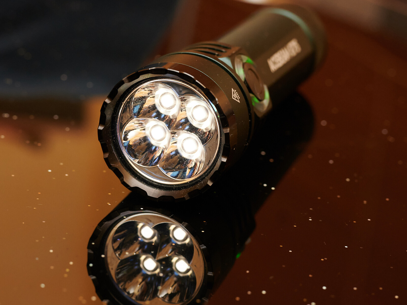 Um die Leuchtleistung zu schaffen, nutzt Acebeam eine Konstruktion, die vier LEDs im Viereck bündelt. Wer nun befürchtet, der Lichtkegel könnte vielleicht keine Kegelform haben, den können wir beruhigen. Der erzeugte Lichtkegel ist sehr gleichmäßig. Wobei das in einem Wald oder ähnlichem Setting eher unwichtig ist. Hier hat Acebeam ganze Arbeit geleistet.