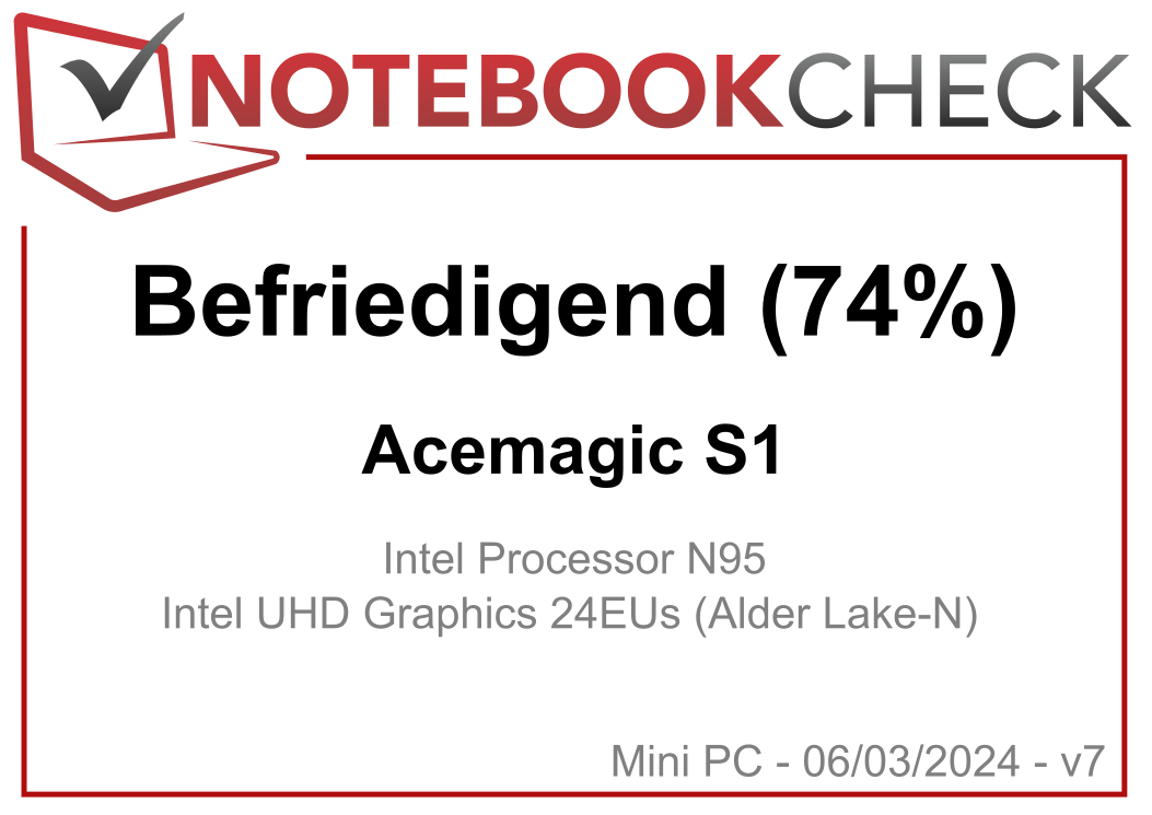 | 74.1 % v7 (old) | 11 / 2023 | Acemagic S1 N95, UHD Graphics 24EUs (Alder Lake-N) | 440 g | 239 EUR |